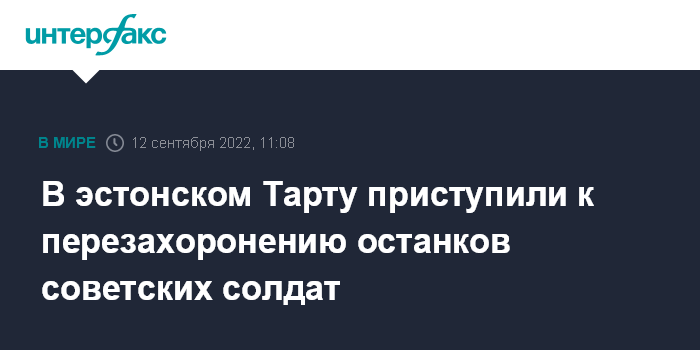 Москва. 12 сентября. INTERFAX.RU - В эстонском городе Тарту начались работы по перезахоронению останков советских солдат на братской могиле в парке Раади и переносу надгробного памятника в Тартуский городской музей.