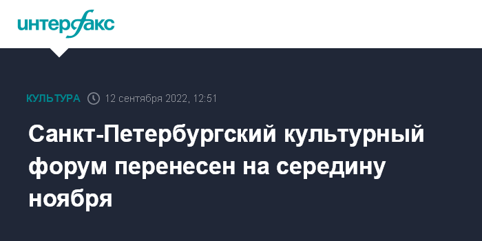 Москва. 12 сентября. INTERFAX.RU - Санкт-Петербургский международный культурный форум пройдет с 10 по 12 ноября в обновленном формате, сообщила в Telegram глава Минкультуры Ольга Любимова. Ранее его планировали провести 20-22 октября.