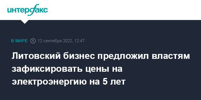 Москва. 12 сентября. INTERFAX.RU - Литовская конфедерация промышленников предлагает властям Литвы договориться о фиксации цены на электроэнергию на длительный срок - не менее пяти лет - для того, чтобы смягчить негативное влияние дороговизны электроэнергии на работу предприятий.