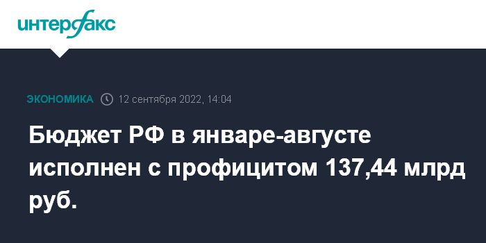 Москва. 12 сентября. INTERFAX.RU - Федеральный бюджет РФ в январе-августе, по предварительным данным, исполнен с профицитом 137,44 млрд рублей, говорится в сообщении Минфина.