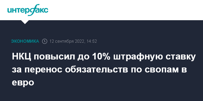 Москва. 12 сентября. INTERFAX.RU - "Национальный клиринговый центр" (НКЦ) с 12 сентября повысил штрафную ставку за перенос обязательств по сделкам своп в евро до 10% с 5%, сообщает сайт "Московской биржи".