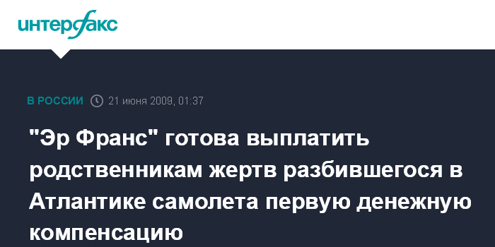Москва. 21 июня. ИНТЕРФАКС - "Эр Франс" выплатит родственникам каждой из жертв авиарейса 447, потерпевшего в этом месяце катастрофу над Атлантикой, $24500 в качестве первоначального возмещения ущерба, сообщил в пятницу вечером руководитель французской авиакомпании Поль-Анри Гуржон.