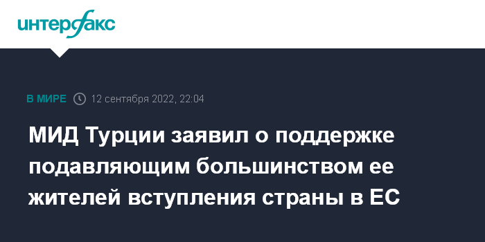 Москва. 12 сентября. INTERFAX.RU - Идея вступления Турции в ЕС очень популярна среди жителей страны, утверждают во внешнеполитическом ведомстве страны.