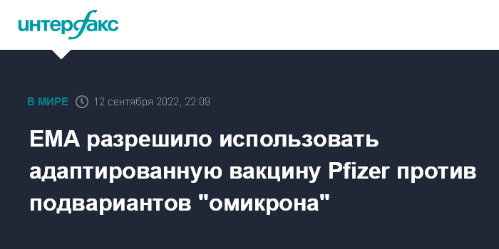 Москва. 12 сентября. INTERFAX.RU - Комитет по лекарственным средствам для человека Европейского агентства лекарственных средств (EMA) рекомендовал разрешить адаптированную двухвалентную вакцину для подвариантов омикрона BA.4 и BA.5 в дополнение к ранее разработанным вакцинам для исходного штамма SARS-CoV-2.