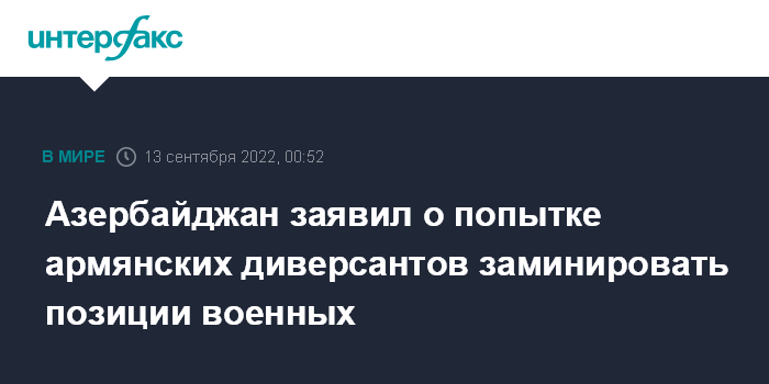 Москва. 13 сентября. INTERFAX.RU - Минобороны Азербайджана заявляет об осуществлении ВС Армении диверсий в направлении Дашкесанского, Кельбеджарского и Лачинского районов Азербайджана.