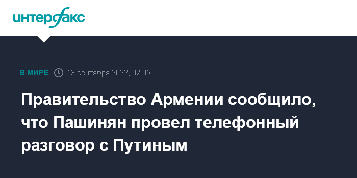 Москва. 13 сентября. INTERFAX.RU - Премьер-министр Армении Никол Пашинян провел телефонный разговор с президентом России Владимиром Путиным, сообщает пресс-служба правительства Армении.
