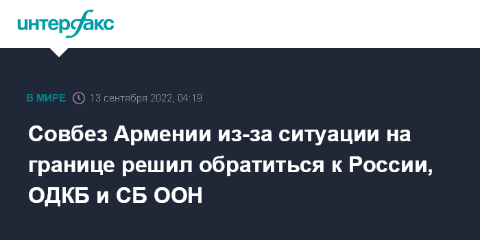 Москва. 13 сентября. INTERFAX.RU - Совет безопасности Армении принял решение официально обратиться к России, ОДКБ и в Совбез ООН в связи с боевыми действиями на границе с Азербайджаном.