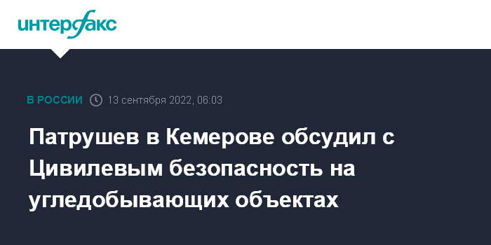 Москва. 13 сентября. INTERFAX.RU - Секретарь Совета безопасности России Николай Патрушев в рамках рабочей поездки в Кузбасс провел в Кемерове рабочую встречу с губернатором региона Сергеем Цивилевым.