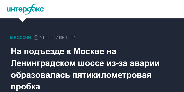 Москва. 21 июня. ИНТЕРФАКС - На Ленинградском шоссе на въезде в Москву в результате ДТП утром в воскресенье образовалась многокилометровая пробка.