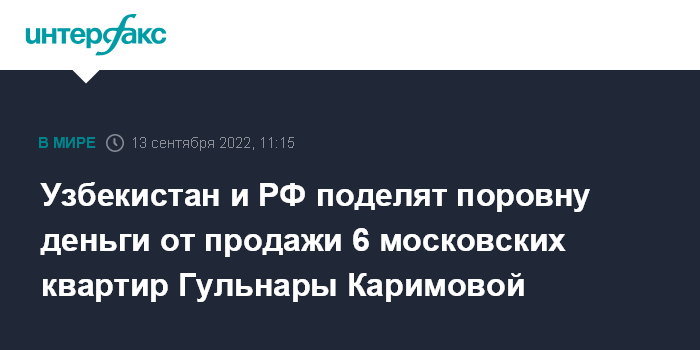 Москва. 13 сентября. INTERFAX.RU - Средства, вырученные от продажи в Москве недвижимости Гульнары Каримовой, старшей дочери экс-президента Узбекистана, будут поделены между узбекской и российской сторонами, сообщил замминистра юстиции республики Музраф Икрамов.
