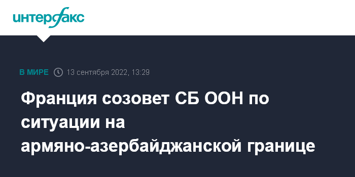 Москва. 13 сентября. INTERFAX.RU - Франция созовет заседание Совбеза ООН для обсуждения ситуации на границе Армении и Азербайджана, сообщают во вторник французские СМИ со ссылкой на Елисейский дворец.