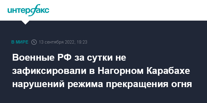 Москва. 13 сентября. INTERFAX.RU - В зоне ответственности российского миротворческого контингента в Нагорном Карабахе за прошедшие сутки не зафиксировано нарушений режима прекращения огня, сообщили в Минобороны РФ.