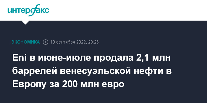 Москва. 13 сентября. INTERFAX.RU - Итальянская Eni после разрешения США поставлять венесуэльскую нефть в Европу продала на этом рынке в июне-июле 2,1 млн баррелей за 200 млн евро, следует из отчета компании.