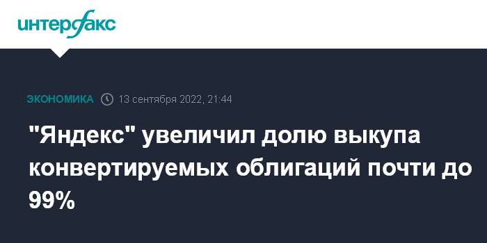 Москва. 13 сентября. INTERFAX.RU - "Яндекс" реализовал опцион по выкупу конвертируемых облигаций, увеличив эту долю до 98,7%, говорится в пресс-релизе компании.