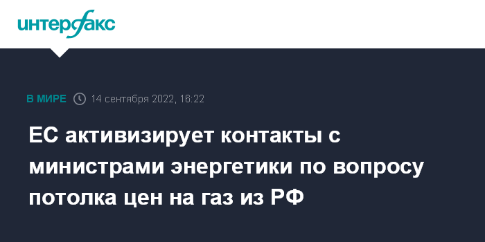 Москва. 14 сентября. INTERFAX.RU - ЕС планирует активизировать контакты с министрами энергетики стран-членов для дальнейших обсуждений идеи введения потолка цен на российский газ, заявила в среду член Еврокомиссии (ЕК) по энергетике Кадри Симсон.