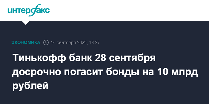 Тинькофф банк 28 сентября досрочно погасит бонды на 10 млрд рублей