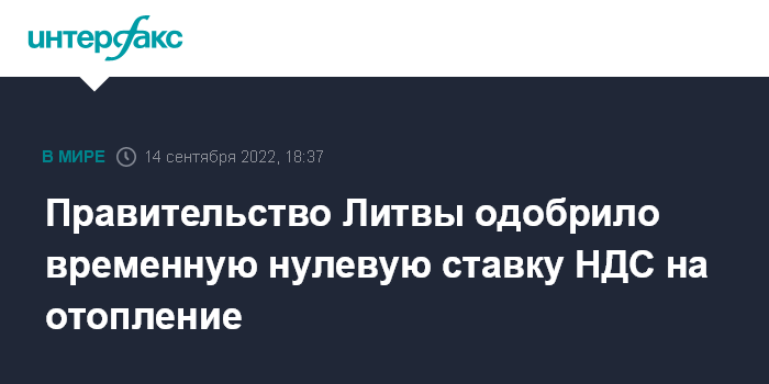 Москва. 14 сентября. INTERFAX.RU - Правительство Литвы одобрило предложение Минфина о применении нулевой ставки налога на добавленную стоимость (НДС) на централизованное отоплению в ближайшие два отопительных сезона.