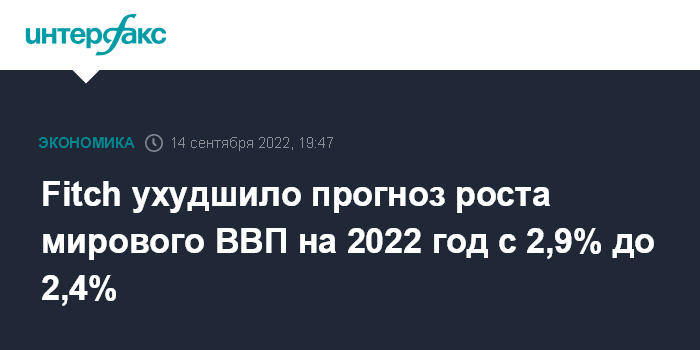 Москва. 14 сентября. INTERFAX.RU - Агентство Fitch Ratings ухудшило прогноз роста мировой экономики на 2022 год до 2,4% с ожидавшихся в июне 2,9%.