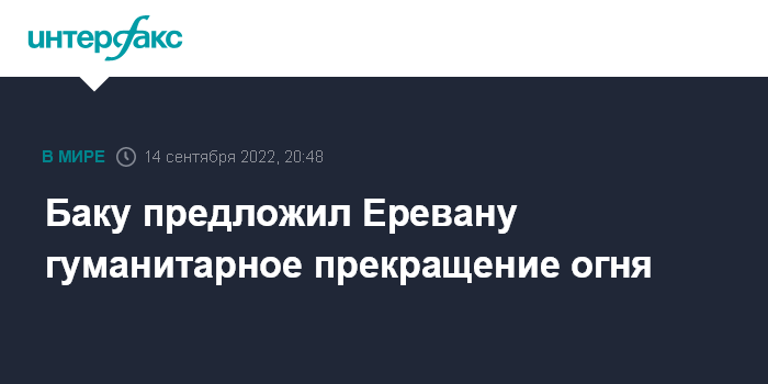 Москва. 14 сентября. INTERFAX.RU - Баку в одностороннем порядке предложил Еревану гуманитарное прекращение огня, заявил министр иностранных дел Азербайджана Джейхун Байрамов на встрече со спецпредставителем президента России по международному культурному сотрудничеству Михаилом Швыдким. Об этом говорится в сообщении МИД Азербайджана.