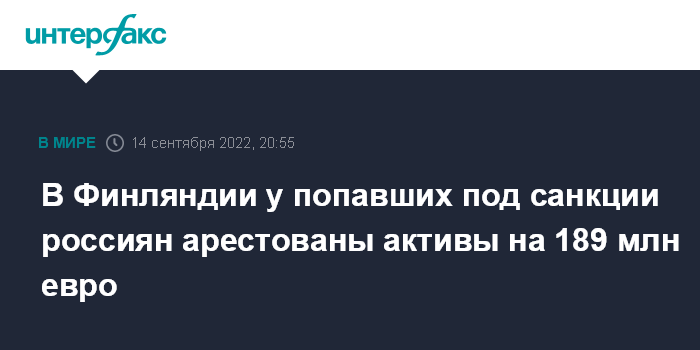 Москва. 14 сентября. INTERFAX.RU - В Финляндии у попавших под санкции россиян арестовано имущество на 189 млн евро, аресты затрагивают десятки организаций, сообщил телеканал MTV News.