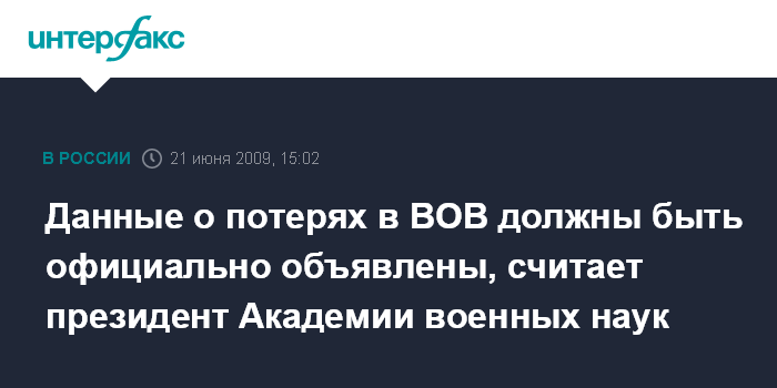 "Одной из главных задач государственной комиссии, которая создается по инициативе Минобороны, по подсчету людских и материальных потерь страны в период Великой Отечественной войны должны быть официальные данные о людских потерях - военнослужащих и мирного населения, а также пропавших без вести", - сказал М.Гареев накануне отмечаемой в России 22 июня годовщины начала Великой Отечественной войны - Дня памяти и скорби.