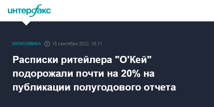 Москва. 15 сентября. INTERFAX.RU - На старте торгов на "Московской бирже" депозитарные расписки ритейлера "О'Кей" подорожали почти на 20% (до 36,4 рубля за штуку) после публикации финансового отчета компании за I полугодие.