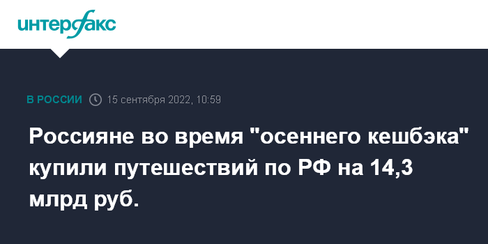 Москва. 15 сентября. INTERFAX.RU - Российские туристы в рамках осеннего этапа продаж с 25 августа по 10 сентября приобрели путешествий по России с кешбэком на 14,3 млрд рублей. Об этом сообщила в четверг глава Ростуризма Зарина Догузова.