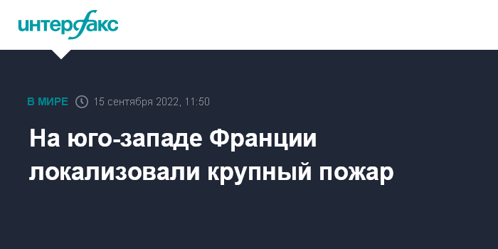 Москва. 15 сентября. INTERFAX.RU - Крупный пожар, который бушевал на юго-западе Франции с понедельника, прекратил распространяться благодаря погодным условиям и действиям пожарных, говорится в сообщении префектуры Жиронды.