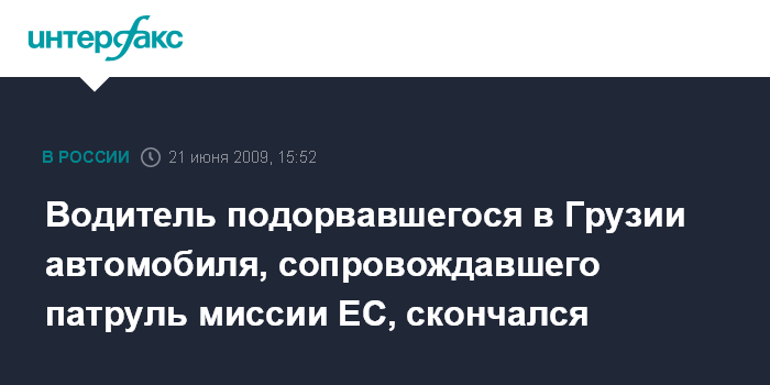 Тбилиси. 21 июня. INTERFAX.RU - Получивший тяжелые ранения в результате подрыва на мине водитель медицинского автомобиля, сопровождавшего патрульную группу миссии ЕС в Грузии, скончался в воскресенье в больнице.