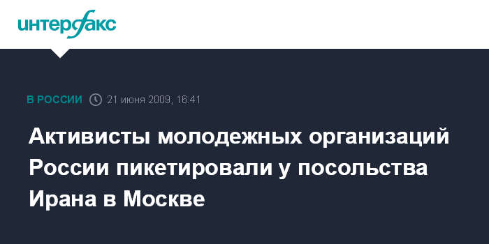 Москва. 21 июня. INTERFAX.RU - Немногочисленный пикет в поддержку честных выборов в Иране провели молодежные организации России у посольства республики в Москве.