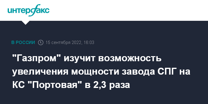 Москва. 15 сентября. INTERFAX.RU - "Газпром" рассмотрит возможность расширения завода по производству СПГ в районе компрессорной станции "Портовая" с 1,5 млн т в год до 3,5 млн т, говорится в сообщении компании.