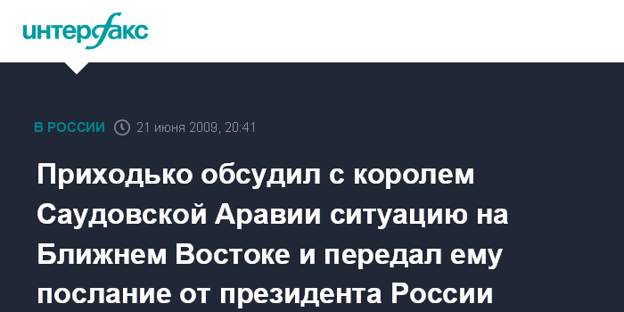 Москва. 21 июня. ИНТЕРФАКС – В воскресенье в городе Джидде состоялась встреча помощника президента Российской Федерации Сергея Приходько с королем Саудовской Аравии Абдаллой ибн Абдель Азиз Аль Саудом.