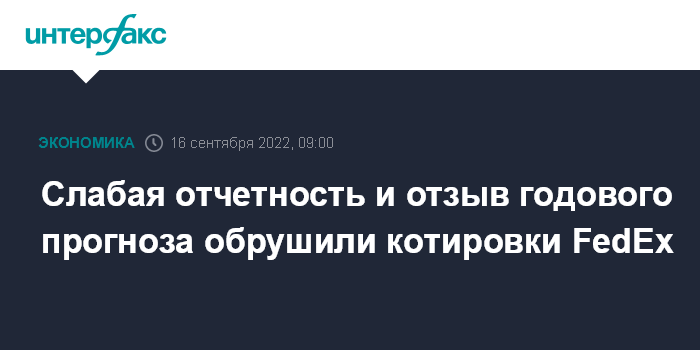 Москва. 16 сентября. INTERFAX.RU - FedEx Corp., одна из крупнейших в мире компаний экспресс-доставки, опубликовала разочаровавшую инвесторов предварительную отчетность за первый квартал 2023 финансового года и отозвала годовой прогноз, после чего котировки компании рухнули на дополнительной сессии в Нью-Йорке.