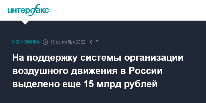 Москва. 16 сентября. INTERFAX.RU - Правительство выделит дополнительные 15 млрд рублей на поддержку ФГУП "Госкорпорация по организации воздушного движения" (ГК по ОрВД, подведомственно Росавиации), сообщает сайт кабинета министров со ссылкой на распоряжение за подписью премьер-министра Михаила Мишустина.