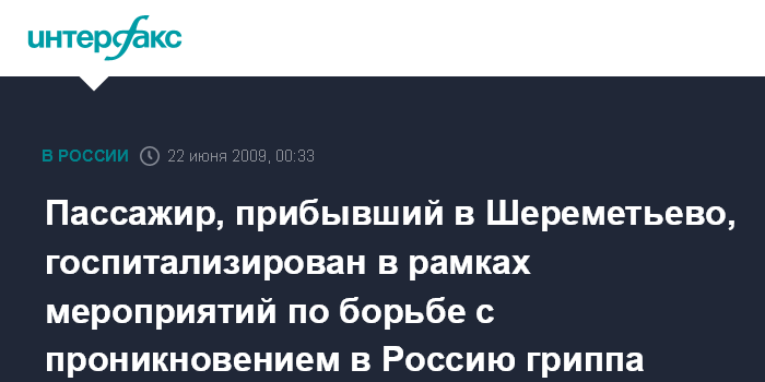 "21 июня при проведении санитарно-карантинного контроля в Московском аэропорту Шереметьево выявлен один больной с подозрением на ОРВИ, госпитализирован в ИКБ №1. Клинический материал от больного направлен в вирусологическую лабораторию ФГУЗ "Центр гигиены и эпидемиологии в городе Москве", - говорится в сообщении, размещенном на сайте Роспотребнадзора.
