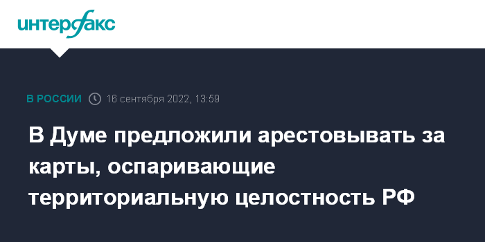 Москва. 16 сентября. INTERFAX.RU - За распространение и публичную демонстрацию карт, оспаривающих территориальную целостность России, будет введен штраф до одного миллиона рублей для юрлиц или арест на срок до 15 суток для граждан.