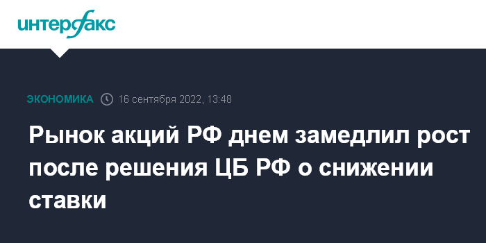 Москва. 16 сентября. INTERFAX.RU - Рынок акций РФ днем в пятницу замедлил рост после решения ЦБ РФ снизить ставку на ожидаемые 0,5 процентных пункта (до 7,5% годовых), игроки начали локально фиксировать прибыль; индекс МосБиржи после роста утром в район 2470 пунктов вернулся ниже 2460 пунктов.
