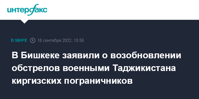 Москва. 16 сентября. INTERFAX.RU - Таджикская сторона вновь открыла огонь по позициям киргизских пограничников, сообщила в пятницу пресс-служба пограничной службы Госкомитета нацбезопасности Киргизии.