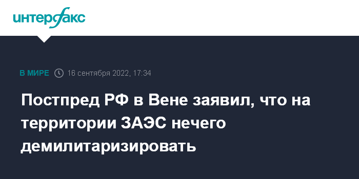 Москва. 16 сентября. INTERFAX.RU - Призывы к демилитаризации территории Запорожской АЭС нереалистичны - на ней нет тяжелой военной техники и армейских подразделений, а охранные подразделения российская сторона со станции снимать не намерена, заявил постпред РФ при международных организациях в Вене Михаил Ульянов.