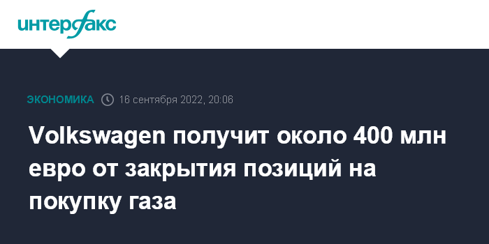 Москва. 16 сентября. INTERFAX.RU - Volkswagen AG (VW) получит сотни миллионов евро прибыли благодаря закрытию позиций на покупку природного газа на фьючерсном рынке, сообщает Bloomberg.