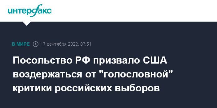 Москва. 17 сентября. INTERFAX.RU - Российская дипмиссия в Вашингтоне отреагировала в своем телеграм-канале на слова официального представителя госдепартамента США Неда Прайса, раскритиковавшего единый день голосования в РФ.