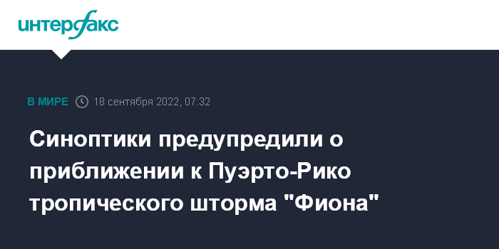 Москва. 18 сентября. INTERFAX.RU - Синоптики в субботу предупредили о приближении к Пуэрто-Рико тропического шторма "Фиона", который может усилиться до урагана. Об этом пишет Associated Press.