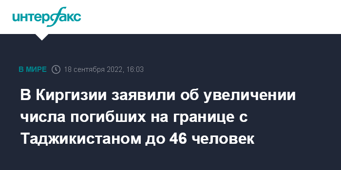 Москва. 18 сентября. INTERFAX.RU - Число погибших в результате вооруженного конфликта в Баткенской области на границе с Таджикистаном возросло до сорока шести человек, сообщили в воскресенье в пресс-службе Минздрава Киргизии.