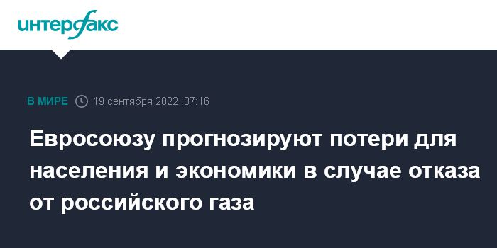 Москва. 19 сентября. INTERFAX.RU - Европа не сможет пройти предстоящую зиму и 2023 год без сохранения поставок газа из России или значительного сокращения экономики, к такому выводу пришли эксперты "Яков и партнёры" в исследовании "Европейский энергетический баланс в новой реальности".