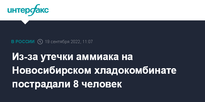 Москва. 19 сентября. INTERFAX.RU - В Кировском районе Новосибирска на АО "Новосибирский хладокомбинат" в понедельник произошла утечка аварийно химически опасного вещества, есть пострадавшие, сообщили в областном управлении МЧС. Сначала говорилось о четырех пострадавших, затем - о восьми.