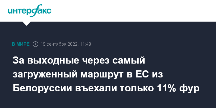 Москва. 19 сентября. INTERFAX.RU - В минувшие выходные через самый загруженный маршрут в ЕС из Белоруссии смогло въехать только 11% фур, сообщили в понедельник в Госпогранкомитете республики.