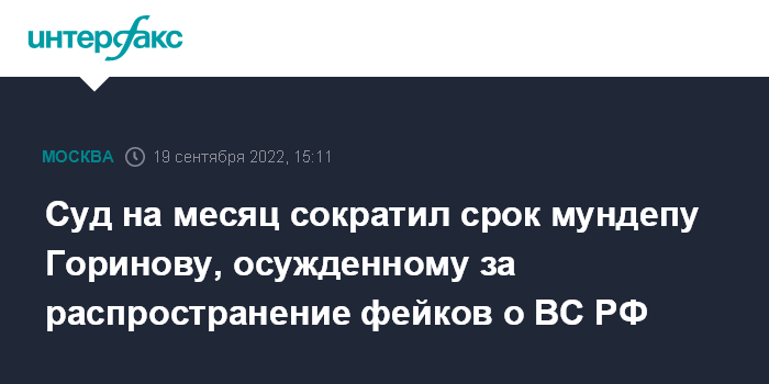 Москва. 19 сентября. INTERFAX.RU - Московский городской суд сократил срок наказания на один месяц муниципальному депутату Красносельского округа Москвы Алексею Горинову, который был осужден на 7 лет колонии общего режима за распространение ложной информации о деятельности Вооруженных сил РФ.