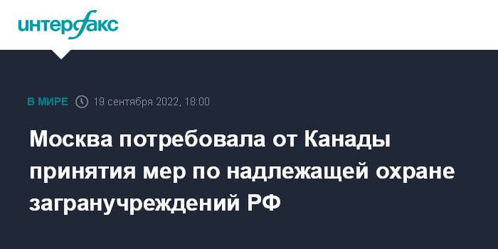 "Российская сторона потребовала незамедлительного принятия мер по обеспечению надлежащей охраны российских загранучреждений, а также сотрудников и членов их семей, в соответствии с обязательствами канадской стороны по Венской конвенции о дипломатических сношениях 1961 года", - говорится в сообщении.