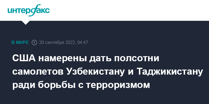 Москва. 20 сентября. INTERFAX.RU - США рассматривают возможность предоставления Узбекистану и Таджикистану почти 50 военных самолетов в обмен на помощь в борьбе с террористами в Афганистане, сообщает Politico.