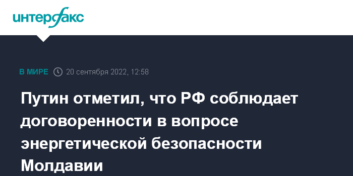 Москва. 20 сентября. INTERFAX.RU - Россия действует в строгом соответствии с двусторонними договорённостями в вопросах энергетической безопасности Молдавии, заявил президент РФ Владимир Путин.